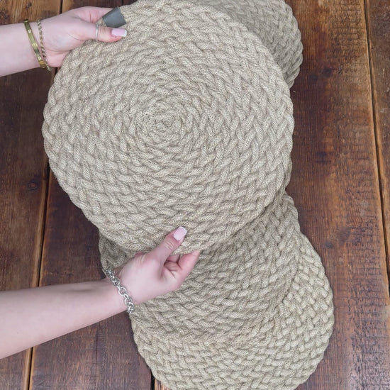 A balance of raw texture and quiet structure. This 30 cm hand-woven placemat is crafted entirely from natural jute, formed into a continuous braided spiral that brings depth and warmth to the table.