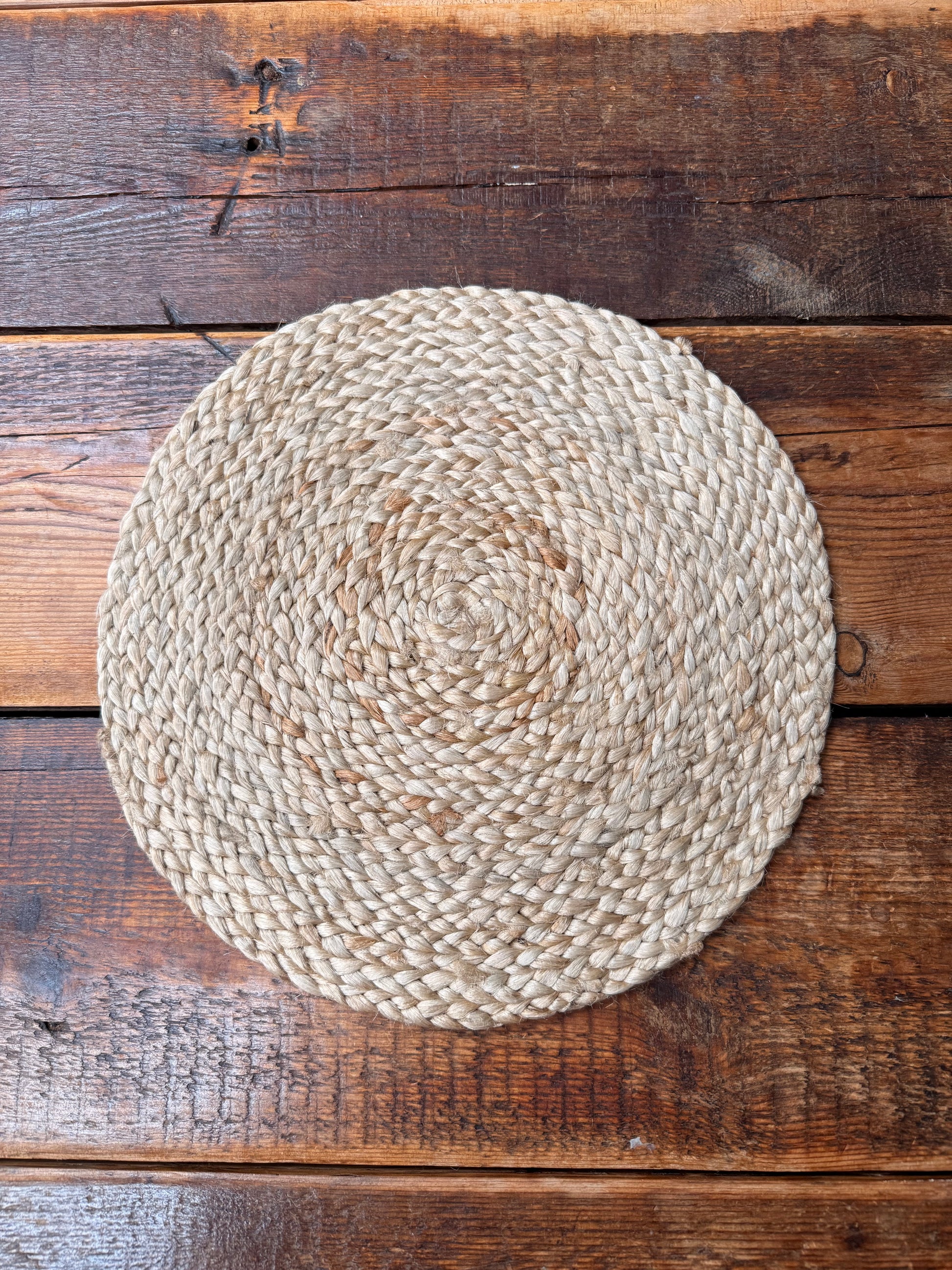A balance of raw texture and clean contrast. This 30 cm hand-woven placemat combines natural jute with soft white woven detailing, arranged in a continuous circular pattern that brings lightness and rhythm to the table.